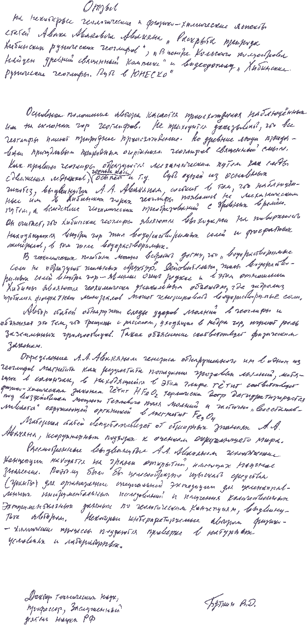 сновное положение автора касается происхождения наблюдённых им на склонах гор геоглифов. Не приходится доказывать, что все геоглифы имеют природное происхождение. Но древние люди придавали причудливым природным очертаниям геоглифов священный смысл. Как правило геоглифы образуются механическим путём как следы сдвижения ледников, горных масс, осыпей и т.д.. Суть одной из основных гипотез, выдвинутых А.А. Авакяном, состоит в том, что наблюдённые им в Хибинских горах геоглифы появились не механическим путём, а вследствие геохимических преобразований с древних времён. Он считает, что Хибинские геоглифы являются выходами на поверхность находящихся внутри гор жил водорастворимых солей и фосфатных минералов, в том числе водорастворимых. В геохимических пособиях можно встретить догму, что „водорастворимые соли не образуют жильных структур”. Действительно, жилы водорастворимых солей внутри гор — явление очень редкое и в этом отношении Хибины являются геохимически уникальным объектом, где гидролиз изобилия фосфатных минералов может генерировать водорастворимые соли. Автор статей обнаружил следы ударов молний в геоглифы и объясняет это тем, что трещины с рассолом, уходящие в недра гор, играют роль заземлённых громоотводов. Такое объяснение соответствует физическим законам. Определение А.А. Авакяном генезиса обнаруженного им в одном из геоглифов магнетита как результата попадания грозовых молний, метящих в солончак, в находящийся в этом глифе гётит соответствует физико–химическим законам. Гётит HFeO2 термически дегидратизируется под воздействием мощного теплового поля молний и частично „восстанавливается” окружающей органикой в магнетит Fe3O4. Материал статей свидетельствует об обширных знаниях А.А. Авакяна, неординарных подходах к оценкам окружающего мира. Рассмотренные выдвинутые А.А. Авакяном геологические концепции находятся на грани открытий, имеющих научное значение. Поэтому было бы целесообразно изыскать средства (гранты) для организации специальной экспедиции для целенаправленных инструментальных исследований и получения количественных экспериментальных данных по геологическим концепциям, выдвинутым автором. Некоторые интерпретируемые автором физико–химические процессы поддаются проверке в натурных условиях и лабораторных. |